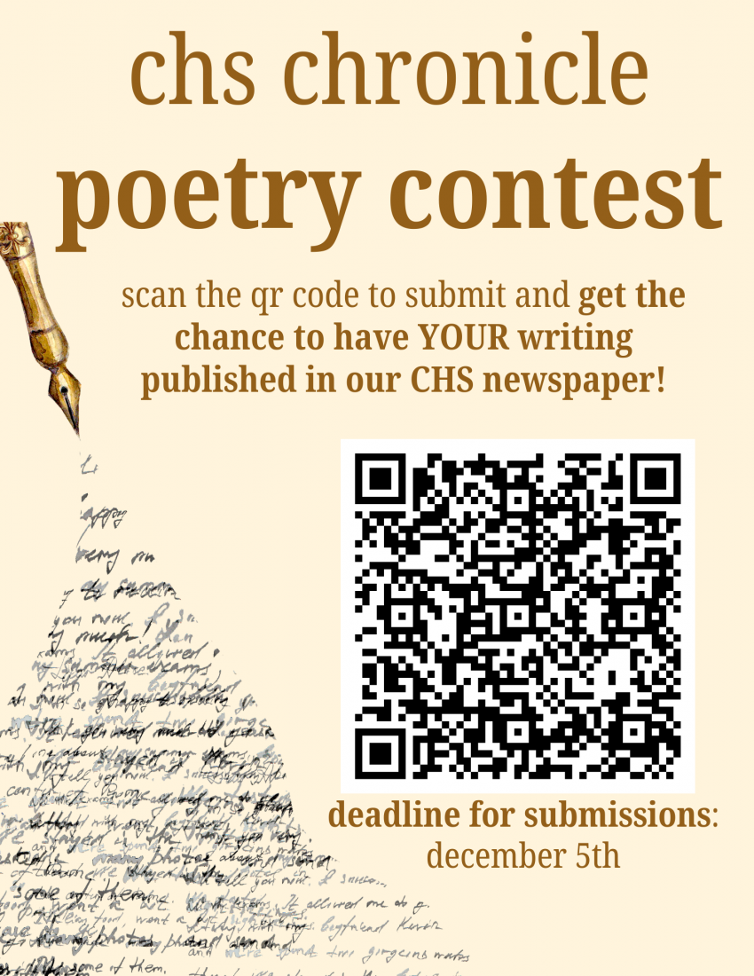 Hello CHS! After reading all of your amazing submissions, we have the long-awaited results of our first-ever poetry contest. Even if you didn’t enter, you probably saw all the tan posters stuck around the school.